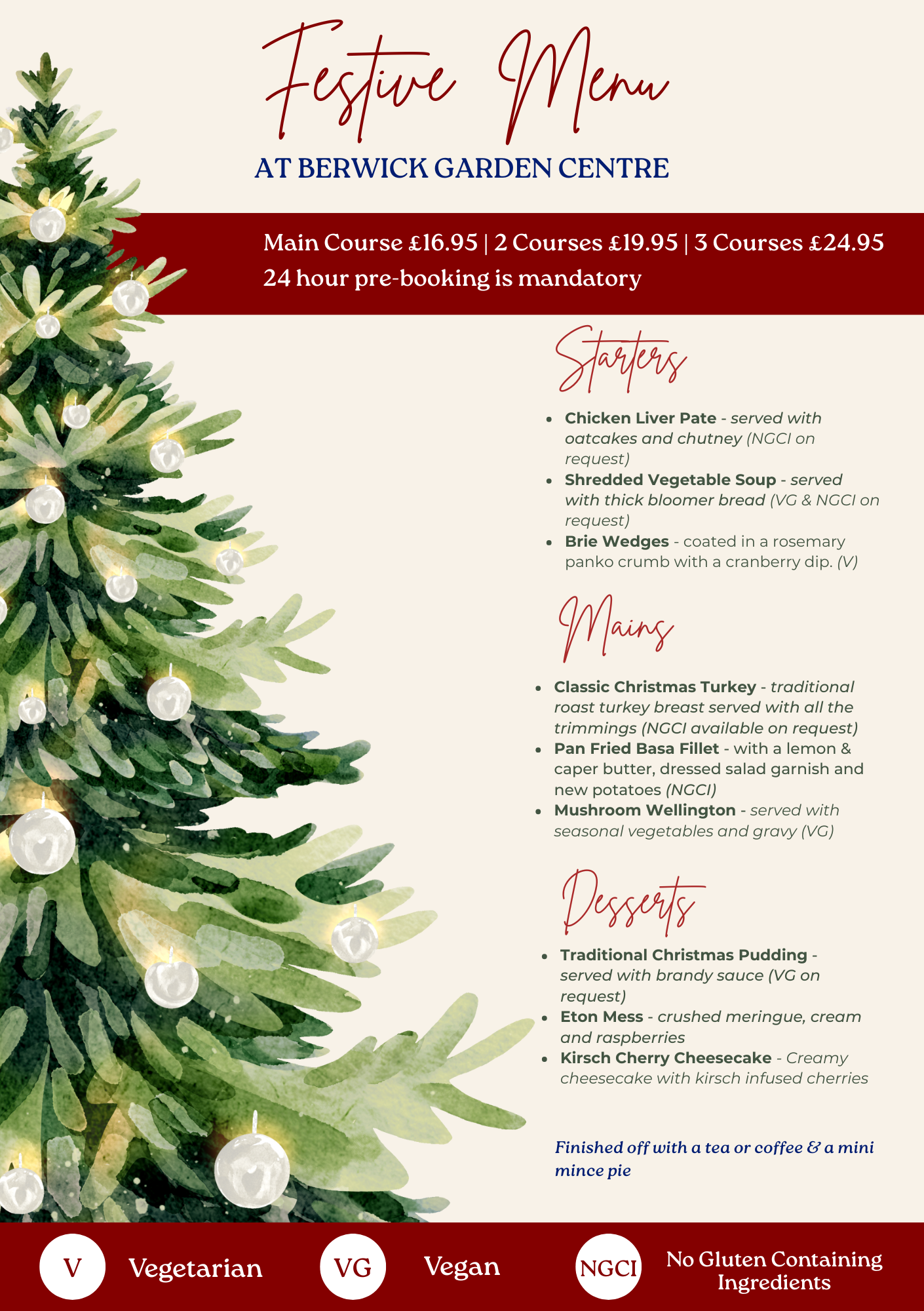 Available to book 7 days a week, £10 deposit per person is required at the time of booking. Pre-ordering is necessary. Book today by popping into our restaurant or by giving us a call on 01289 302383. Each booking receives a dressed table with crackers within our restaurant for their booking.
